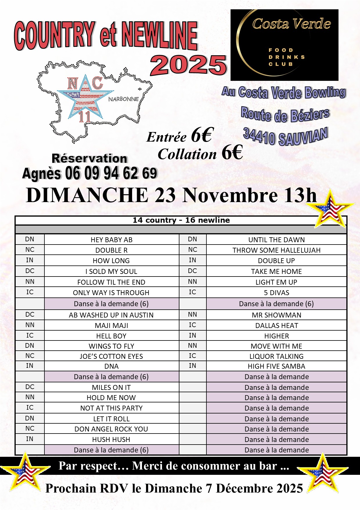 | Dimanche 23 Novembre | Sauvian (34)  | New Country 11 (Agnès)  |