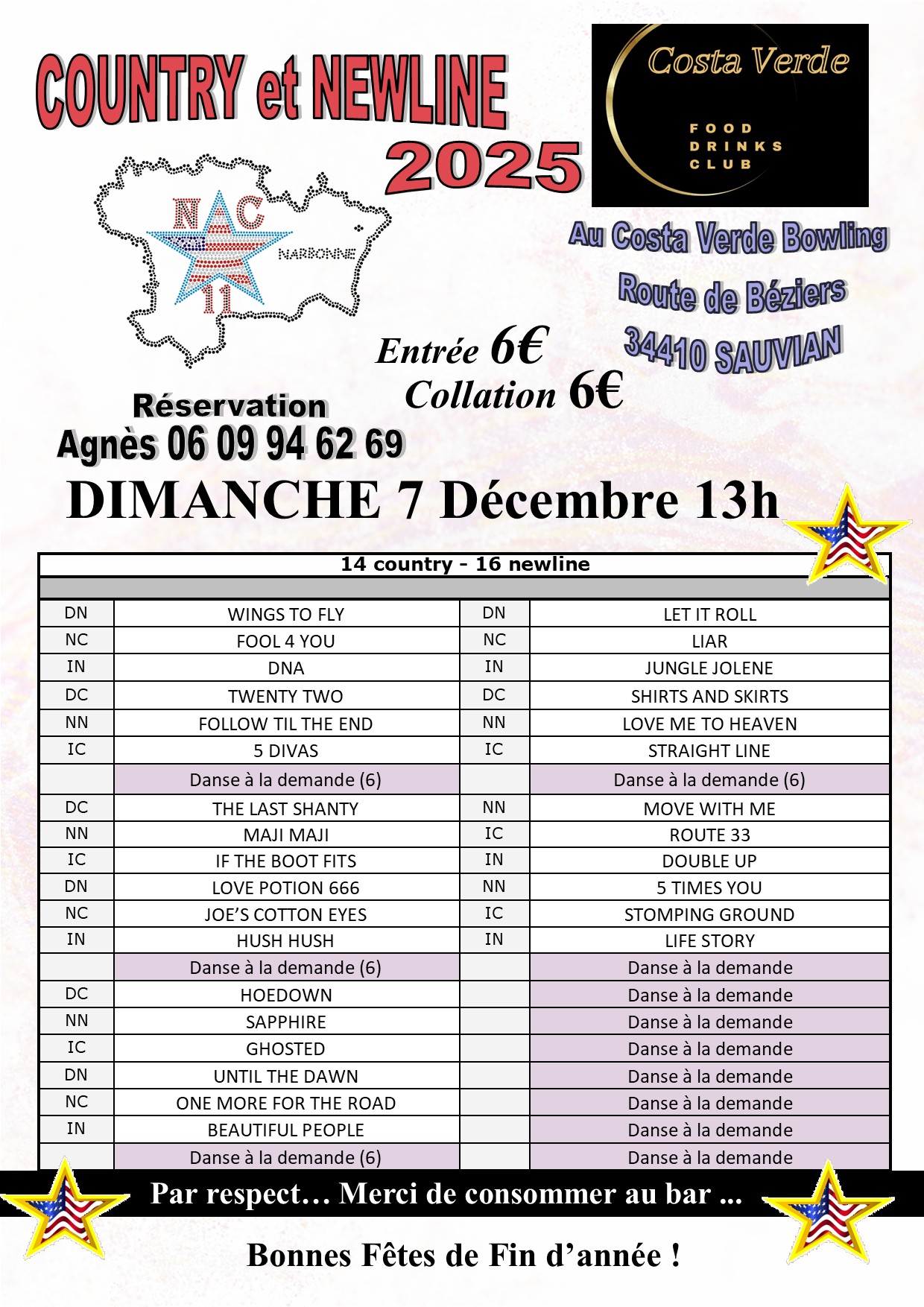 | Dimanche 7 Décembre | Sauvian (34)  | New Country 11 (Agnès)  |